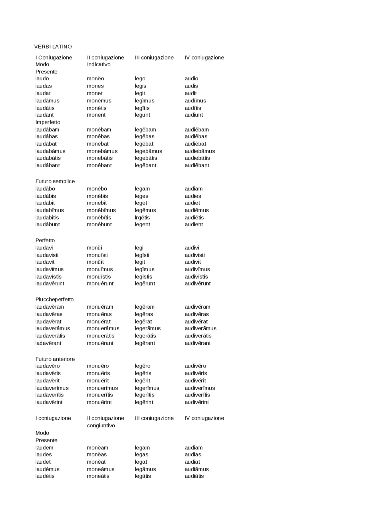 Tabella di verbi in latino 4 coniugazioni (laudo, moneo, lego, audio), tutti i tempi Schemi